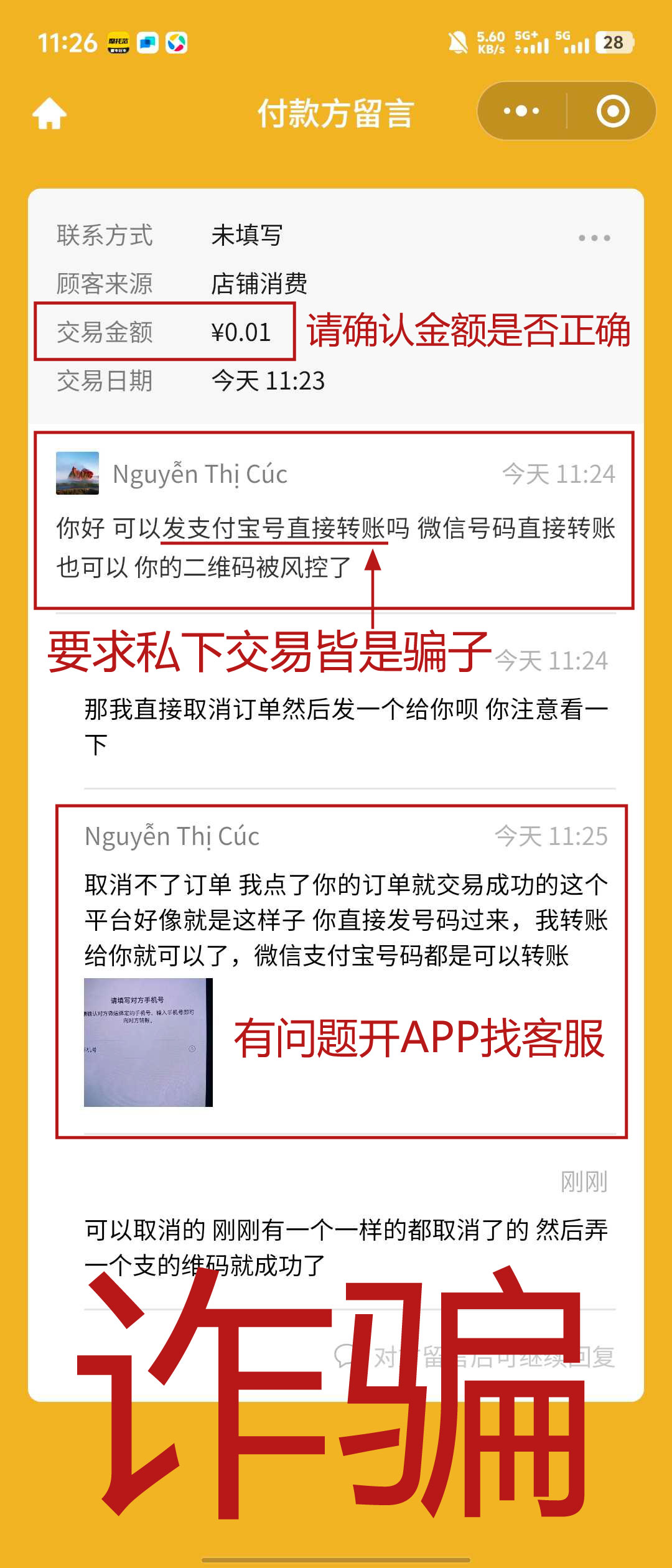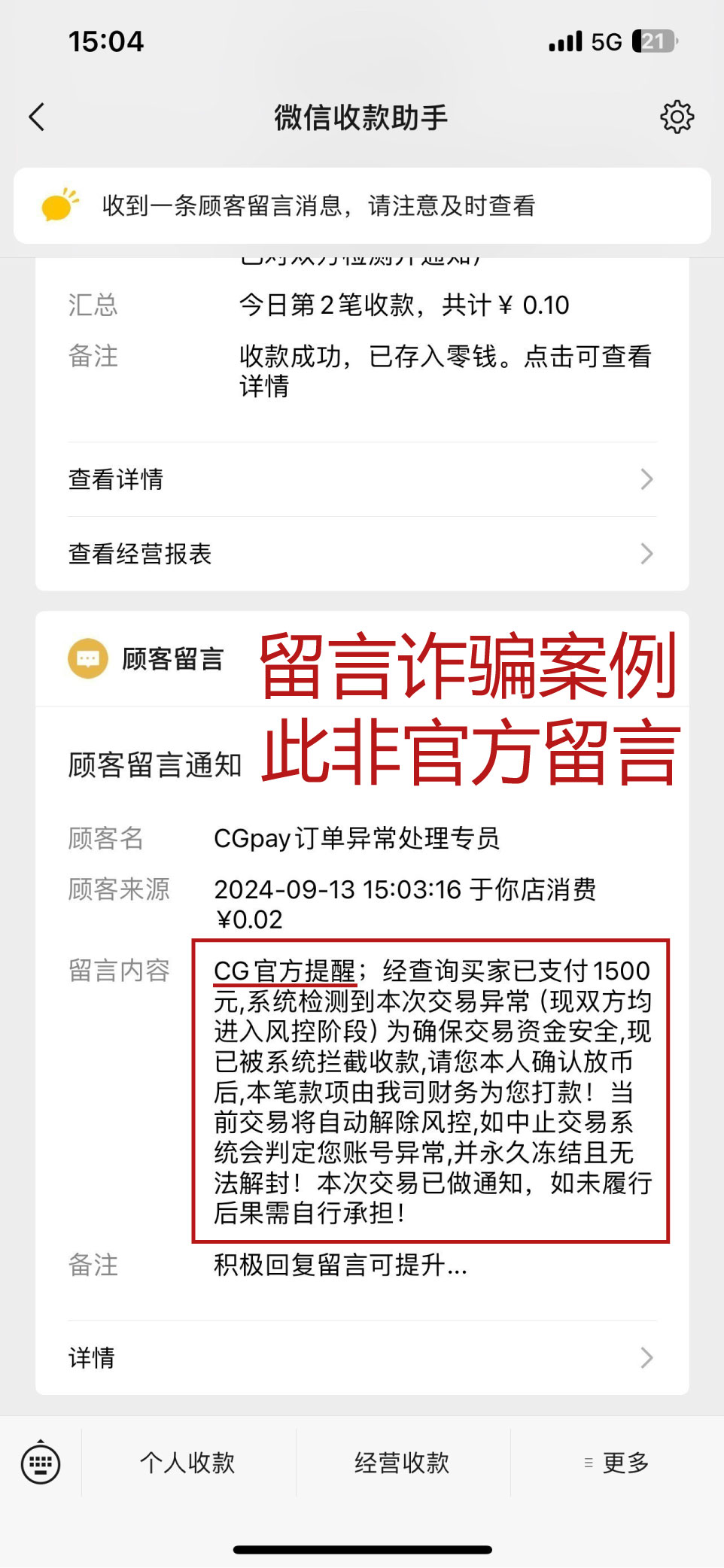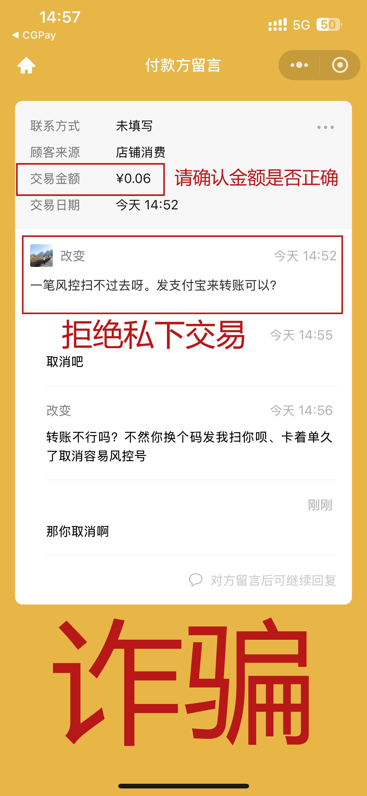 近期常见的诈骗套路包括:诈骗者先向受害者付款异常金额 (如0.01或0.02元),并在备注中表示 ”因风控所以大额扫不进”,同时提供微信号、QQ号等,要求卖方添加好友,或引导卖方主动提供联系方式。以上皆属骗子的手法。看到异常金额请立即提高警觉,这是诈骗惯用伎俩之一。