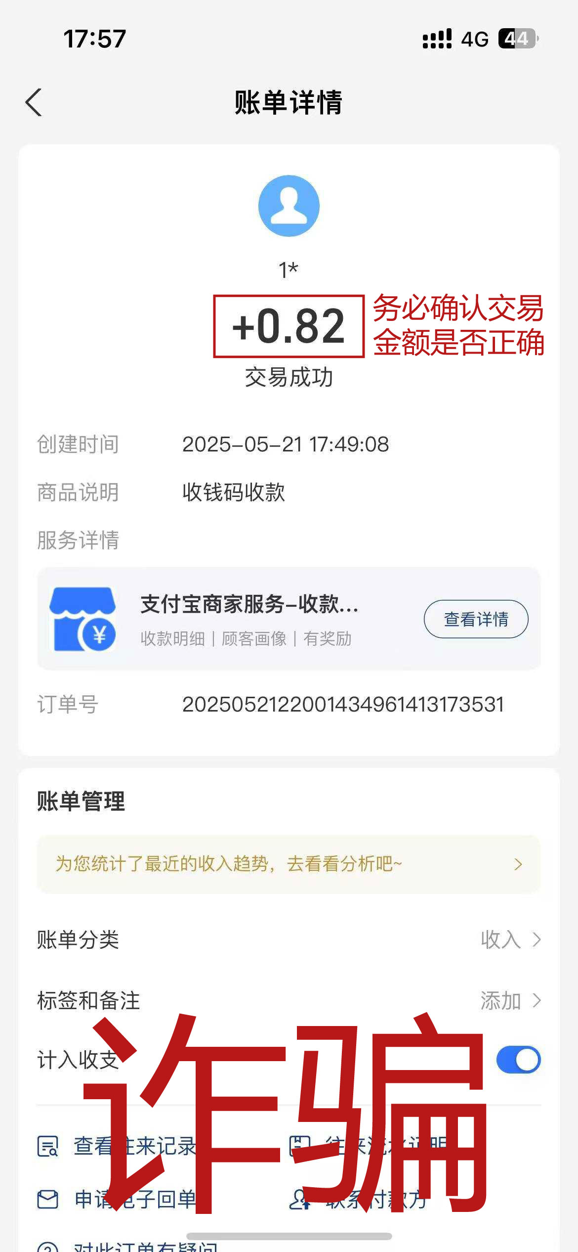 “交易金额“ 务必确认清楚,这才是到账后最应该核对的关键;而 “顾客名称“ 与 “备注“ 正是骗子最常用来欺骗受害者的手法。