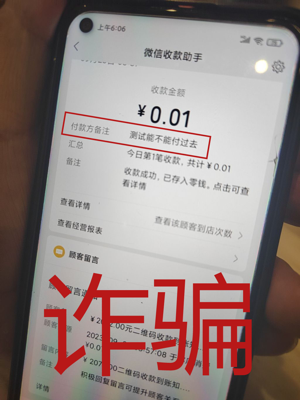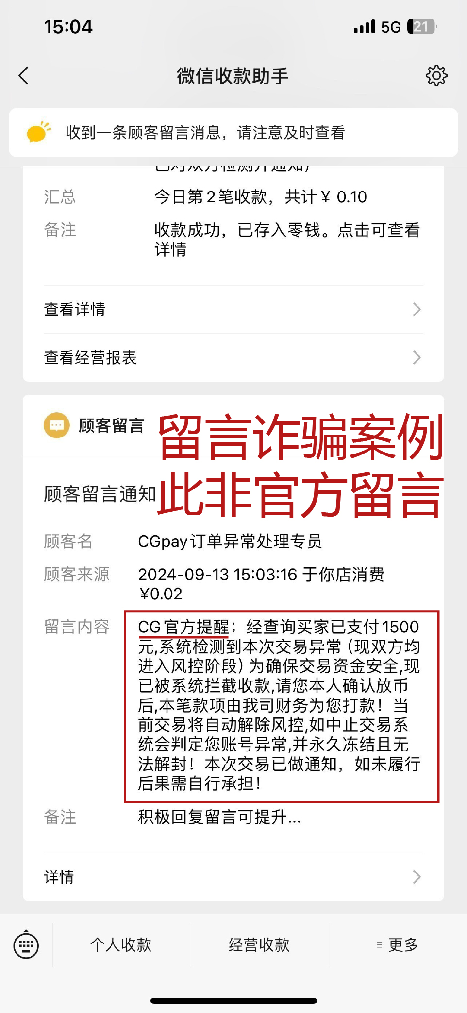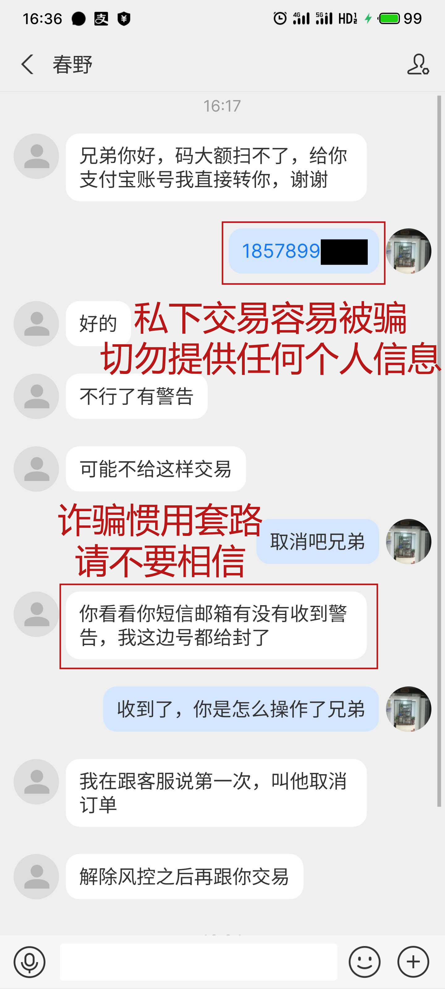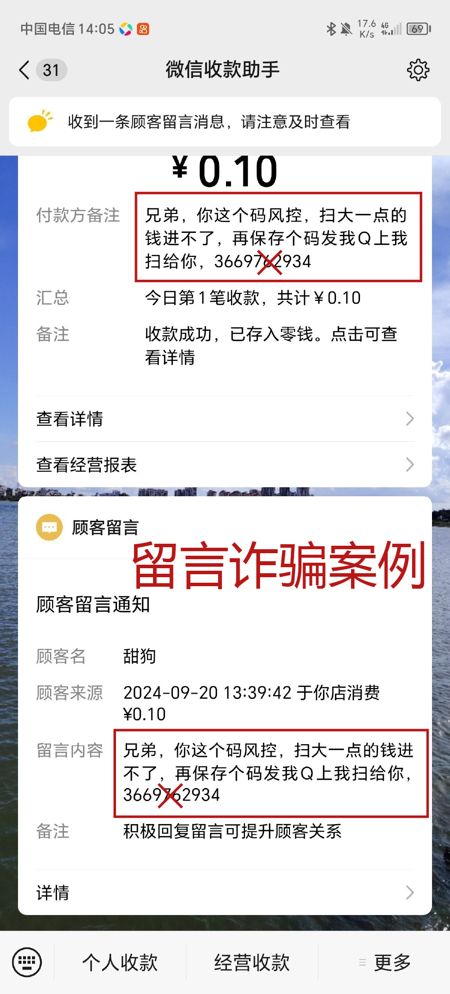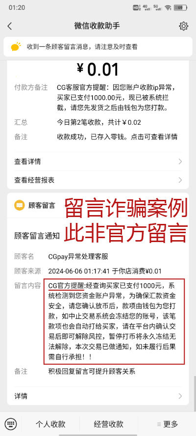 3.备注留言:诈骗者先付款异常金额(如0.01元)给受害者,并在备注中表示 “因风控问题,大额扫不进”,同时提供微信号、QQ号等,要求卖方添加好友,或诱导卖方主动提供联系方式。