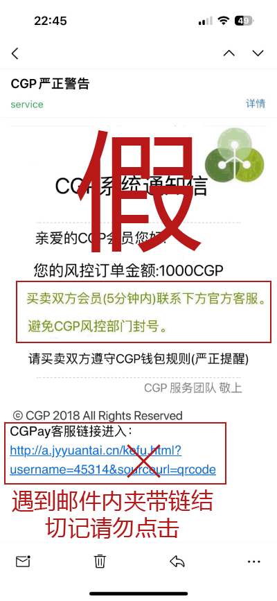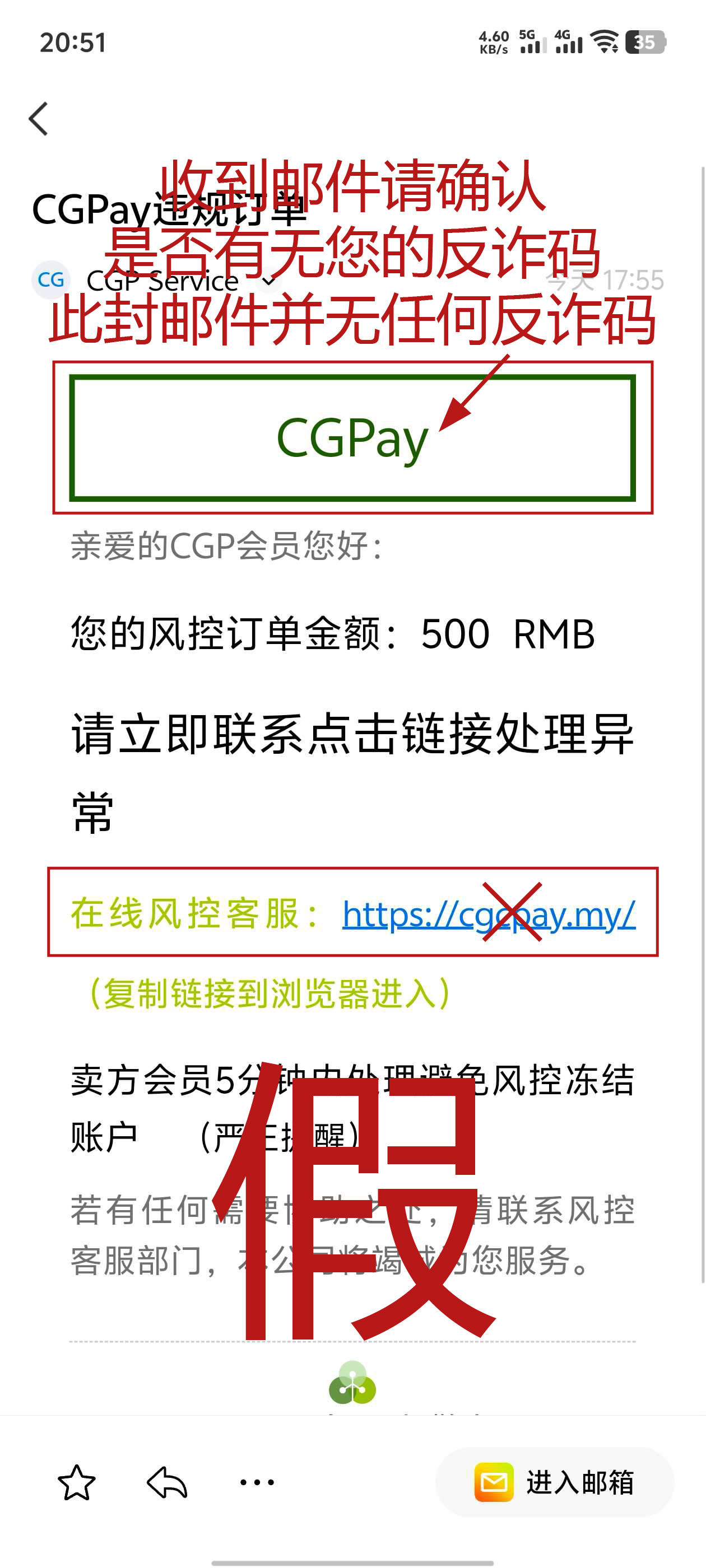 若您收到要求 “取消订单后请继续完成解除” 的邮件,或谎称 “账户被冻结”,并要求您向账户存入CG币,请直接忽略,也不要点击任何链接,更切勿回复对方任何个人信息。