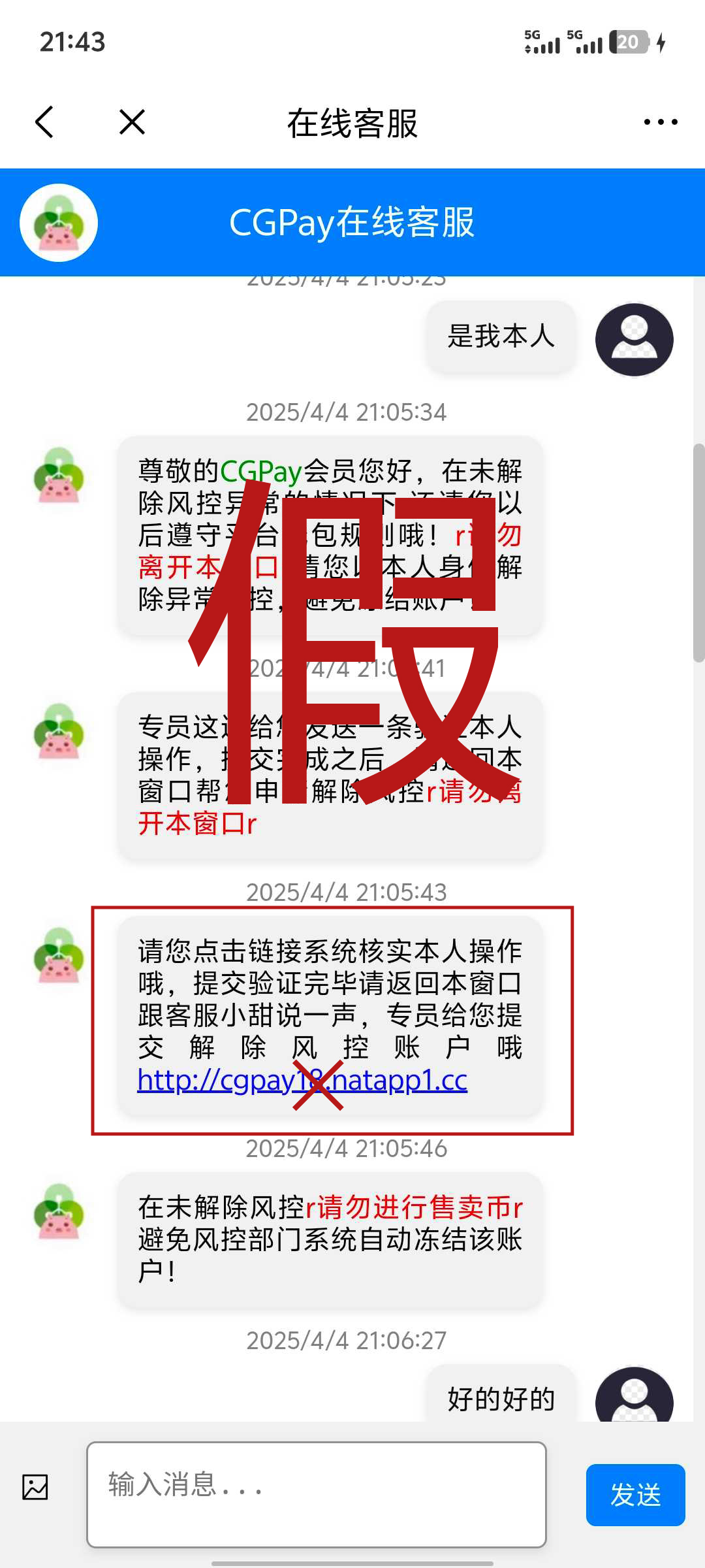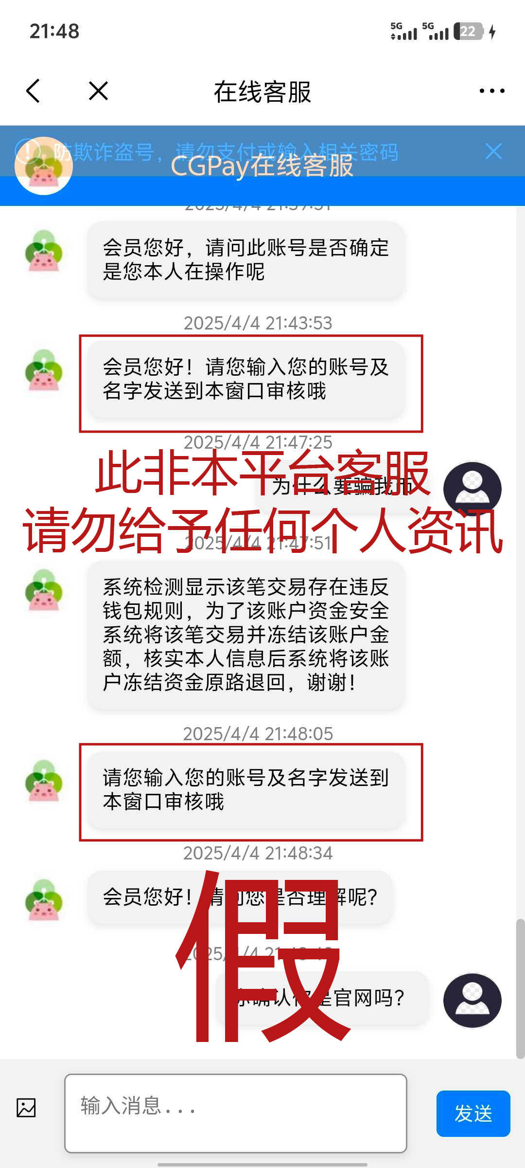 钱包已多次强调,CGPay客服唯一入口就是在钱包内部。若遇到订单异常、买家不付款、卖家不打币等情况,请打开钱包进入客服界面询问